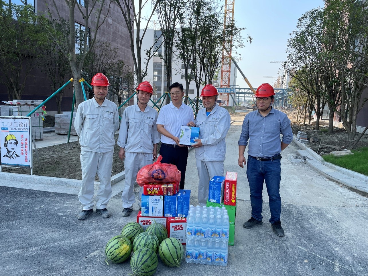 在施工现场,公司领导向大家的辛勤付出表示感谢,对不畏酷暑、守岗敬业的精神给予肯定,并叮嘱他们要注意身体,加强防暑降温工作,同时切实做好中试基地现场施工的安全管控工作。